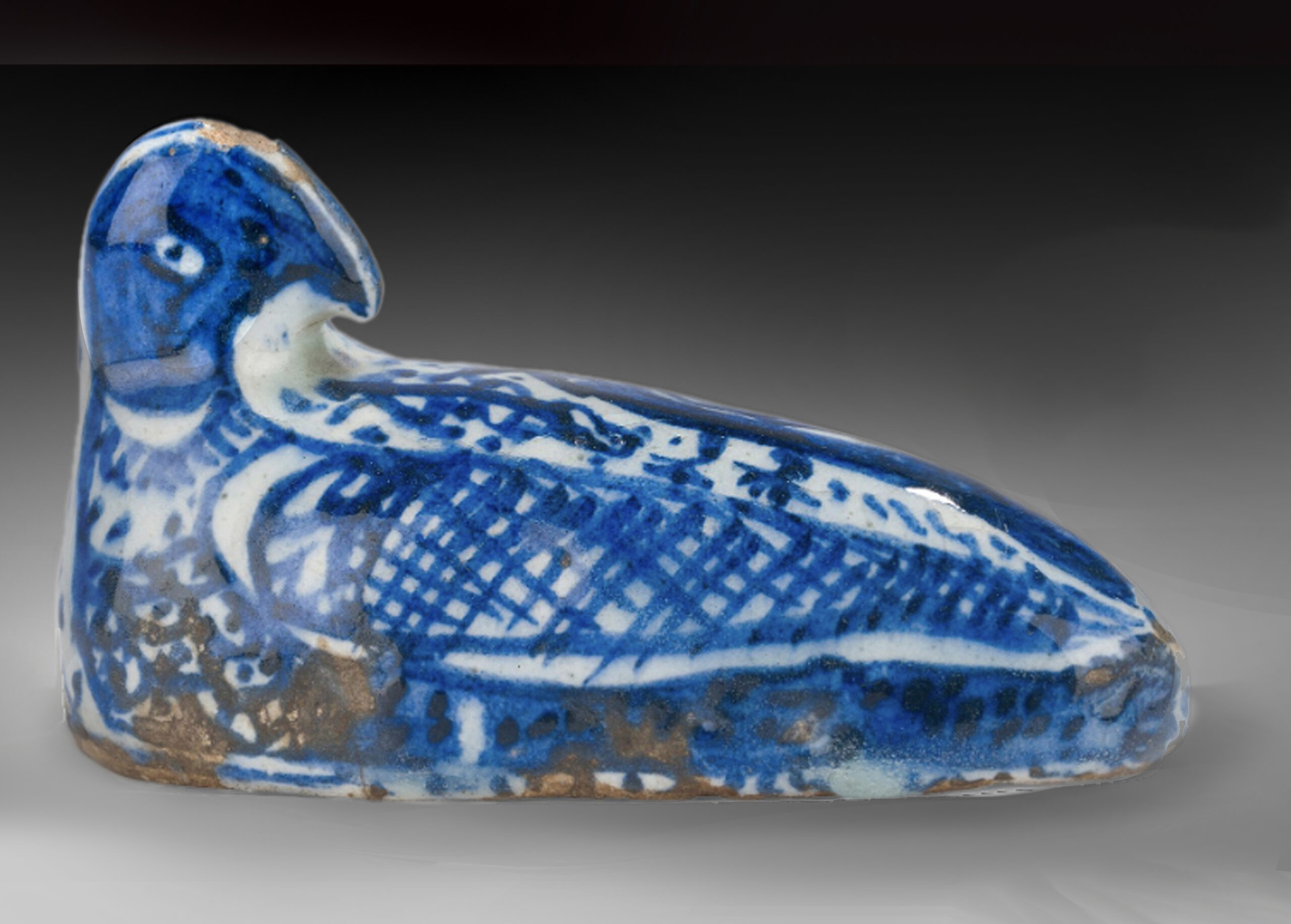 Acquisition d'un grattoir de hammam en céramique aviforme à décor peint en bleu sur fond blanc sous glaçure transparente, la base en pierre ponce, grelots internes.